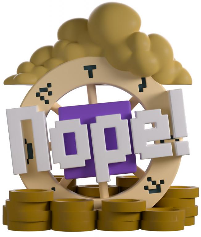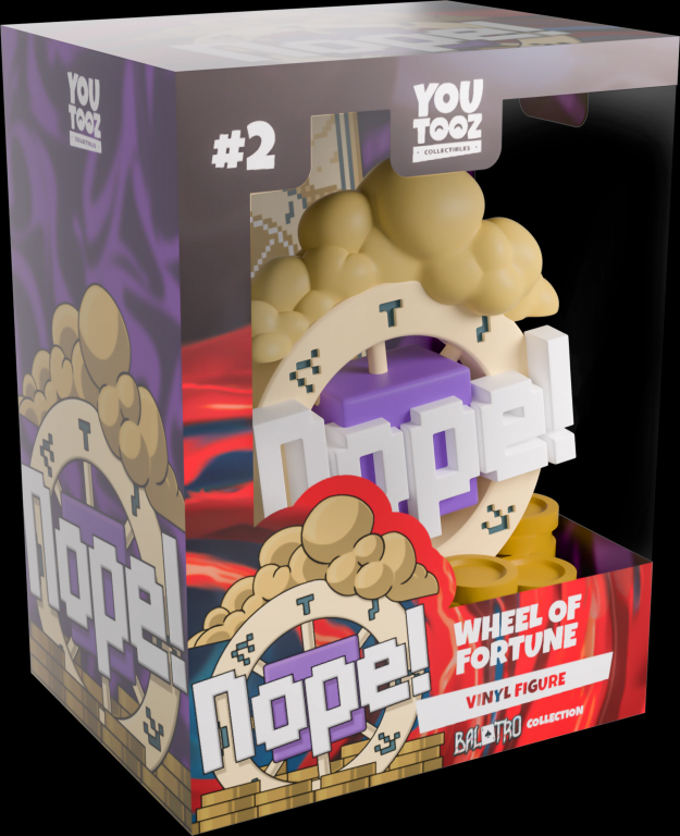 What’s it going to land on? It’s gonna be good, I can feel it! Resting atop a pile of haphazardly stacked golden chips at 4.5 inches tall, its round surface has dark markings around the outside as a huge ‘Nope!’ rests at its center on a purple block, and dark clouds billow over the top ominously. The exterior of its packaging features a poker hand full of golden cards, Wheel of Fortune at the center, while the same cards litter the interior over a swirling purple background. This then transforms into a vivid red to billow over the protective sleeve, where his figure can be seen through the large, clear window at the packaging’s front. This collectible ships in a matte, embossed, protective outer sleeve and a custom-sized plastic protector for maximum protection during shipping.