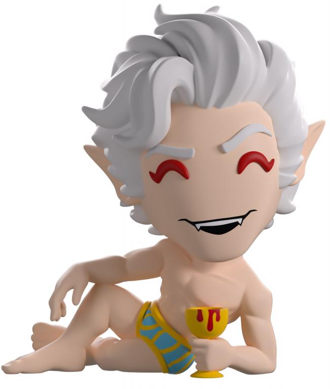 Astarion has returned to Youtooz to treat you to a night full of seduction! Lying relaxed and devilishly welcoming at 4 inches tall as he holds a golden goblet to his front that has deep red blood spilling over the lip, his fangs poke out from a seductive smirk as he raises an eyebrow over vibrant red eyes. With silver-white hair sweeping to the side effortlessly over pointed ears, he wears nothing but blue and yellow striped shorts, leaving his muscular torso exposed. The exterior of his packaging sees him lounging on an elegant bed, while the interior is covered in floating red petals over a pink background. These then flow onto the protective sleeve, where his figure can be seen through the large, clear window at the packaging’s front. This collectible ships in a matte, embossed, protective outer sleeve and a custom-sized plastic protector for maximum protection during shipping.