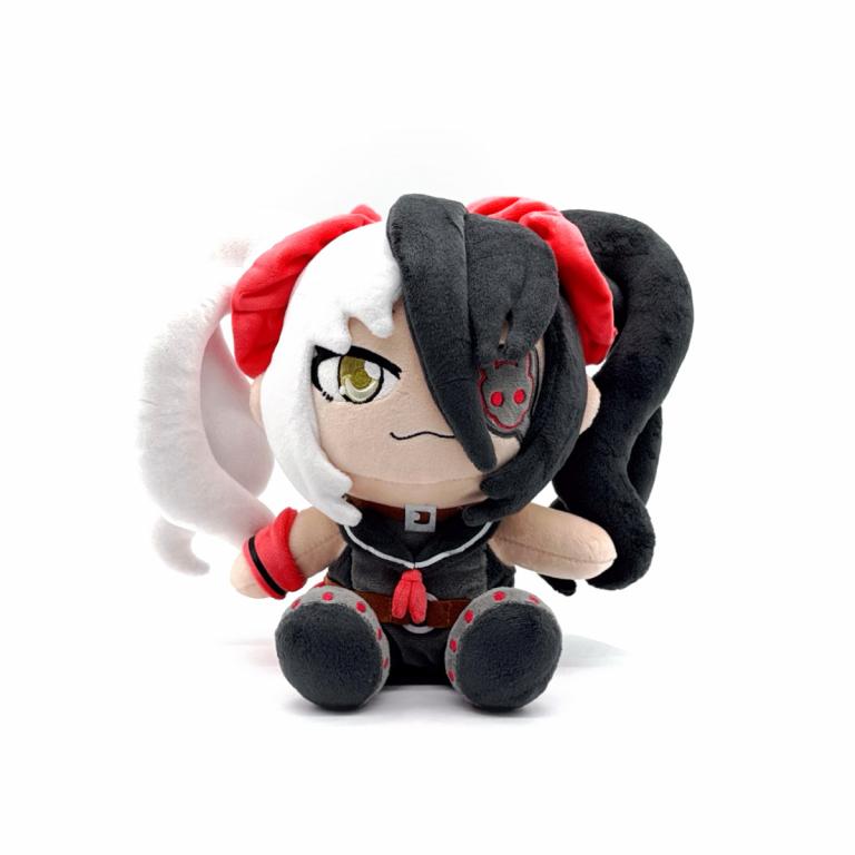 With a blast from her Gatling gun and a cheeky smile, Poharan leaves her enemies and fans stunned in her plush debut! Sitting fiercely at 9-inches tall with her legs kicked forward and wearing black and grey shoes along with a matching sleeveless jumpsuit, her dark outfit is broken up with red detailing, a bright cuff on her right arm, multi-tiered skirt and red scrunchies that hold up her pigtails. With a green eye shining from underneath the fringe of her duo-toned black and white hair, the other eye is covered with an eyepatch. This plush is packed to the seams with 100% PP cotton and is made of minky and tricot materials with accents of felt, perfect for cuddling or conquering with!