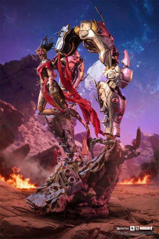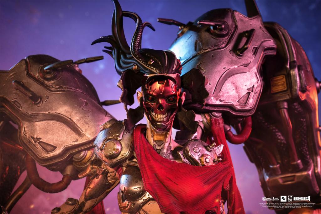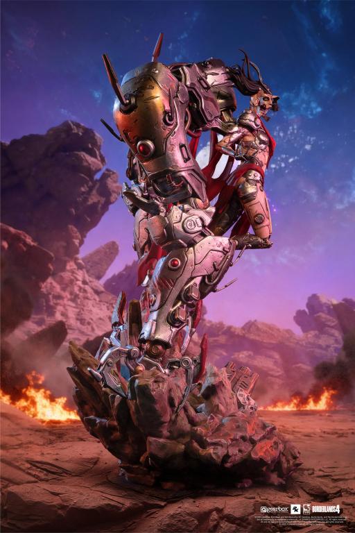 Are you ready to take on Callis, the Ripper Queen? The fearsome ruler of the Rippers from Borderlands 4 towers above a shattered battlefield base covered in the wreckage and chaos of Kairos, including the eerie remains of a Psycho Bandit’s mask. From her massive mechanical arms to her exposed cybernetic frame, every detail of flesh and steel capture her terror and power.