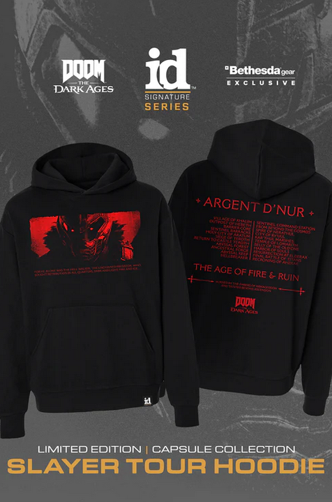 From the fires of Argent D’nur comes the DOOM: The Dark Ages Slayer Tour Hoodie, a brutal homage to the blood-soaked campaign that forged the legend. Created by William Bao as part of the id Signature Series, where the developers behind DOOM: The Dark Ages transform their creative vision into exclusive apparel, this piece captures the fury and myth of the Slayer’s rise. The front design features a striking red portrait of the Doom Slayer wreathed in shadow, paired with his origin verse: “For he alone was the Hell Walker, the Unchained Predator, who sought retribution in all quarters, dark and light, fire and ice...” The back mirrors a concert-tour lineup, listing the legendary locations and battles across Argent D’nur, culminating in “The Age of Fire & Ruin.” Each name a chapter of carnage, printed in crimson — a wearable relic of the Slayer’s eternal crusade.