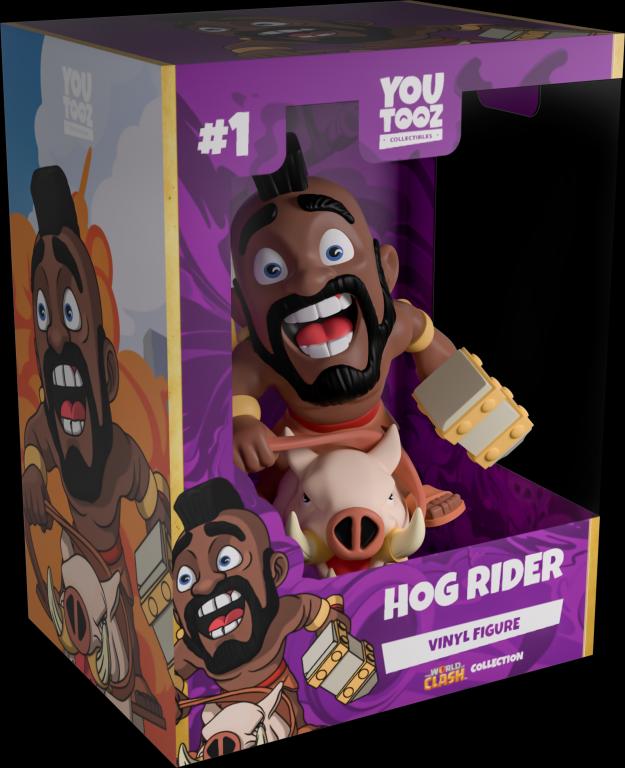 Straight from the app and into real life, we've teamed up with Clash of Clans to bring the Hog Rider to life as a collectible figure! At 4.5 inches tall and frozen in time, this warrior is caught mid shout with an open mouth and thick black beard wrapping around his jaw as a matching mohawk runs down his head. Holding a huge hammer in his right hand and brown reigns in the other, he wears nothing but a waist cloth and sandals while raging underneath him is his trusty tusked steed who has a pink snout above and angry open mouth. The exterior of their packaging has been illustrated to show a stampede of hog riders racing forward with dust kicking up around them. While the interior and protective sleeve both see a collection of The World of Clash's notable characters in a purple design as their figure can be seen through the large clear window at the packaging's front. This collectible ships in a matte, embossed, protective outer sleeve and a custom-sized plastic protector for maximum protection during shipping.