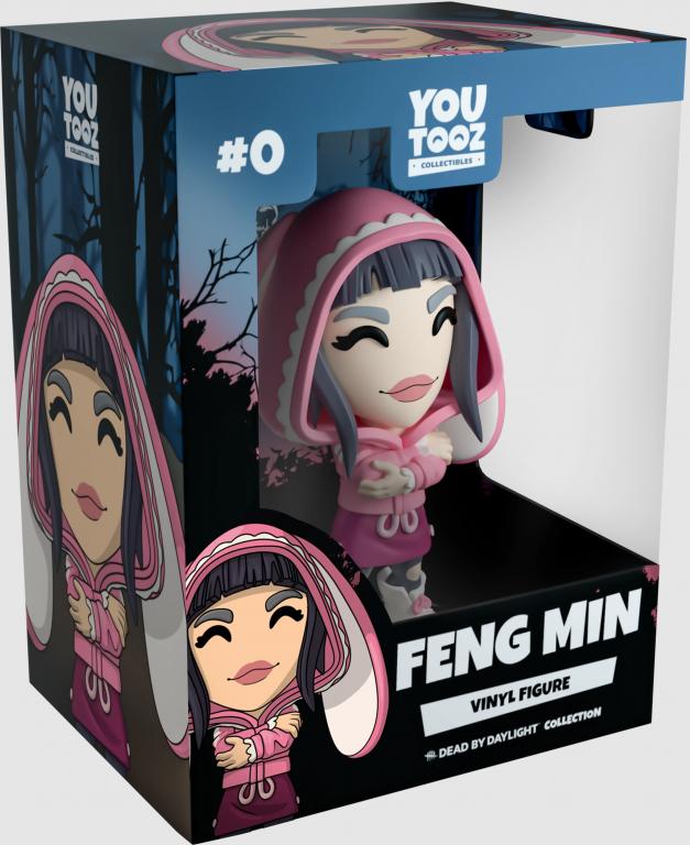 Feng Min has chosen Youtooz as the perfect hiding place! With her arms crossed and standing at 4.2 inches tall, her confident smile beams from juicy pink lips as her black bangs frame her face. Wearing the most adorable bunny hoodie with long thick ears flopping down on either side of her hooded head, its frilled opening along with insides of its ears are a pale creme. Her incredibly cute (and totally practical) outfit is completed with a maroon skirt embellished with pink bows and loops, and black leggings that lead into tall creme boots. The exterior of her packaging sees Feng Min sitting cross legged in a clearing amongst leafless trees. While the interior is a black silhouetted forest with a glowing red and blue haze and the white ‘Dead by Daylight’ logo at its back, This grim motif then continues onto the protective sleeve with dark trees surrounding it completely as the figure can be seen through the large clear window at its front. This collectible ships in a matte, embossed, protective outer sleeve and a custom sized plastic protector for maximum protection during shipping.