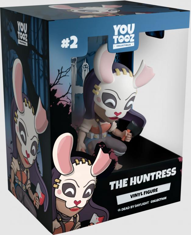 The Huntress has stalked her prey straight to Youtooz! Crouched at 5.1 inches tall with a bunny mask strapped over her head and long purple hair flicking out, one long rabbit ears stretches up while the other is split in half. With bright white eyes shining from the mask’s dark holes and a heart shaped nose sitting above her menacing red smile the mask hides, she brandishes a bloody hatchet in each hand. Ready to finish the hunt, she’s rolled up the sleeves of her red and creme top and wears a blue waist cloth over bandaged brown pants. The exterior of her packaging sees Huntress in front of a deserted log cabin as you hide from her in the bushes. While the interior is a black silhouetted forest with a glowing red and blue haze and the white ‘Dead by Daylight’ logo at its back, This grim motif then continues onto the protective sleeve with dark trees surrounding it completely as the figure can be seen through the large clear window at its front. This collectible ships in a matte, embossed, protective outer sleeve and a custom sized plastic protector for maximum protection during shipping.