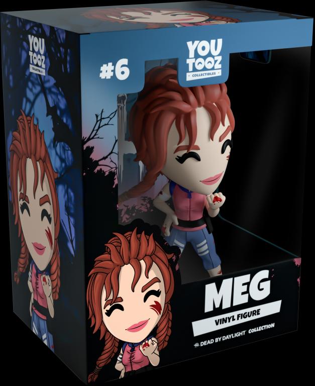 Meg has gracefully and speedily evaded her pursuers to arrive at Youtooz and debut her vinyl figure! Standing with her hands resting triumphantly on her hips at 4.5 inches tall, her head tilts to the side as she lets out a smile from a bloodied face. With her dark red hair tied into three long braids, two of which flick out to the side, her fringe is swept upwards as she wears a dark grey belt around the waist of her pink vest which has a blue collar and shoulders, along with cropped pants and red sneakers. The exterior of her packaging sees Meg vaulting through a window frame effortlessly as she evades her pursuers. While the interior is a black silhouetted forest with a glowing red and blue haze and the white ‘Dead by Daylight’ logo at its back, this grim motif then continues onto the protective sleeve with dark trees surrounding it completely as her figure can be seen through the large clear window at its front. This collectible ships in a matte, embossed, protective outer sleeve and a custom-sized plastic protector for maximum protection during shipping.