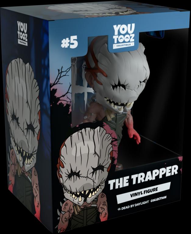 The Trapper has stalked his way into Youtooz to lay the perfect trap for his debut! Standing at 4.6 inches tall and wearing a terrifying cracked mask that has two rows of sharp teeth and a split lower jaw haphazardly strapped over his head, his mangled, cracked flesh is pierced with metal hooks that jut out from his right arm. Leaving a large pool of blood dripping from the gruesome cleaver that is clenched in his reddened fist, he wears dark green overalls and low brown boots. The exterior of his packaging sees The Trapper holding Dwight by the neck and raising him off the ground as he prepares to land the final blow. While the interior is a black silhouetted forest with a glowing red and blue haze and the white ‘Dead by Daylight’ logo at its back, this grim motif then continues onto the protective sleeve with dark trees surrounding it completely as his figure can be seen through the large clear window at its front. This collectible ships in a matte, embossed, protective outer sleeve and a custom-sized plastic protector for maximum protection during shipping.