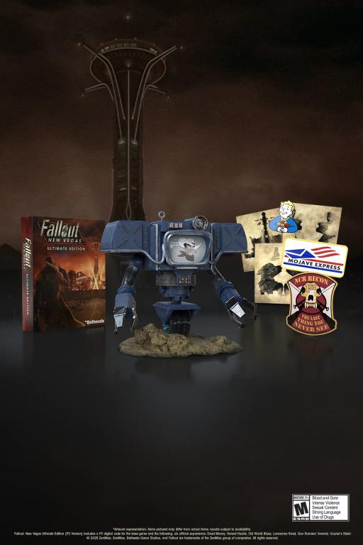 Welcome back to New Vegas and enjoy your stay with this 15th Anniversary Bundle. A must-have for every Courier. The anniversary set combines iconic memorabilia from the Mojave Wasteland with the Ultimate Edition of the game. Explore vast expanses of desert wastelands from small towns to the New Vegas Strip. Choose sides in the upcoming war and forever change the lives of New Vegas inhabitants. Enjoy finely tuned real-time combat mechanics with the V.A.T.S. targeting system, Hardcore mode, and streamlined companion commands. In a huge, open world with unlimited options, you can see the sights, choose sides, or go it alone. Joined by Victor the Securitron, the 15th Anniversary Bundle will bring the spirit of this desert oasis right to your home.