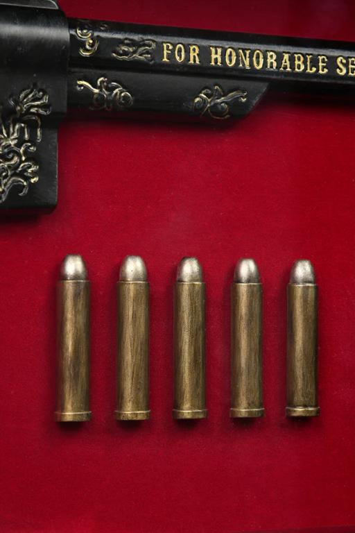 - Material: ABS plastic gun, bullets, and badge with antique finish and gold details