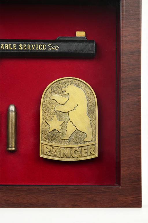 Veteran Ranger, you carry the strength of the New California Republic’s most elite force, and the legacy of the Desert Rangers that came before them. For your decades of courage and commitment to the protection of the men, women, and children of the Wastes; you have earned the highest honor and distinction in the NCR army. May your Fallout Ranger Sequoia Shadowbox serve as a reminder of the justice and peace upheld by your selfless service and sacrifice. Based on a prized weapon within the world of Fallout, this half gun replica shows off the elaborate design of the Sequoia revolver. This is the signature weapon of the NCR Veteran Rangers. Take a close look at its delicate ornamentations; with gold colors in striking contrast against the sequoia’s dark finish.