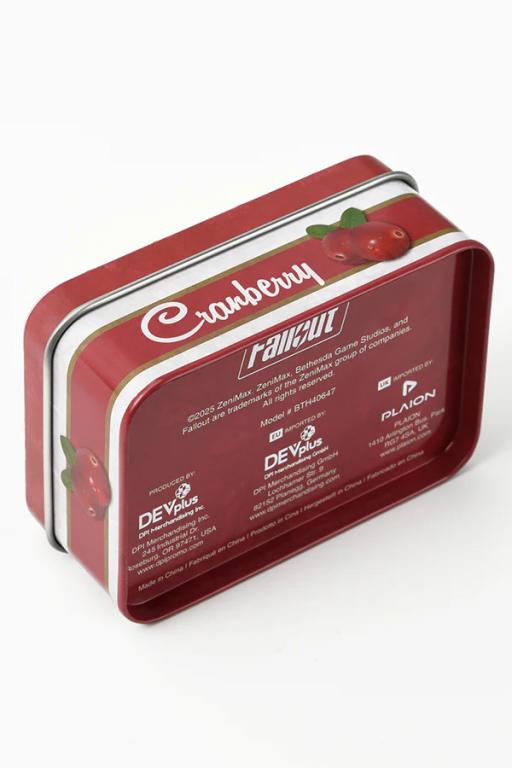 The Fallout Bottle Caps Series: Nuka-Cola Cranberry with Collectible Tin includes a collectible tin box and 20 bottle caps, all featuring a pair of juicy Appalachian cranberries. Keep your stash of cranberry-flavored caps safe, or prepare to protect them from raiders and soda-obsessed Wastelanders!