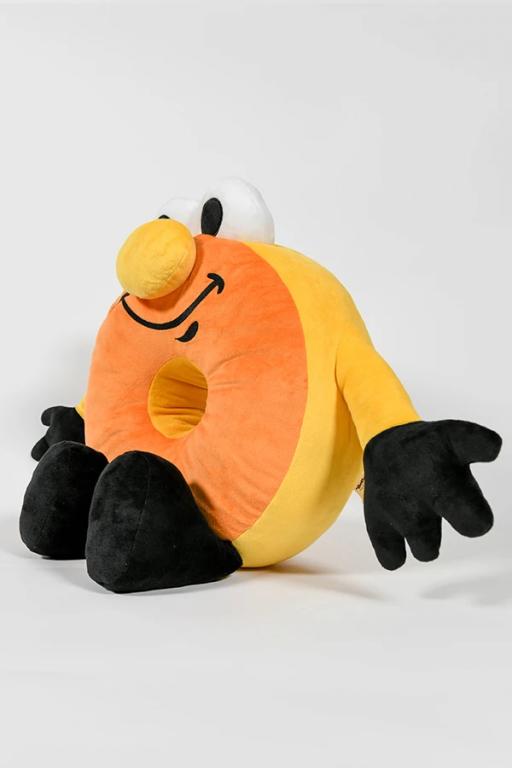 Pre-War, there were plenty of merchandise of famous coffee shop to go around. Nowadays, you're lucky to get a mug with a handle on it. To think we saved these memorabilia from the ravages of time, feral ghouls and stale coffee This soft plushie has a golden tone on the front, mimicking the glaze on donuts. On the flip side, a blonde hue, just like a fresh donut out of the oven. His happy smile and eyes are embroidered in black.