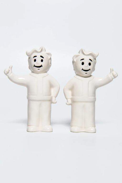 Enjoy vault living with your Fallout Vault 101 Bundle, featuring some essential tools for a wonderful day spent making and eating delicious food! Pop open a cold one off your wall-mounted Vault 101 bottle opener while cooking or grilling. Sprinkle some seasoning to your recipes with a pair of approving Vault Boy shakers, and protect your hand from heat with your Pip-Boy oven mitt. If you made a batch of cookies, you can store them in the tin and snack away.