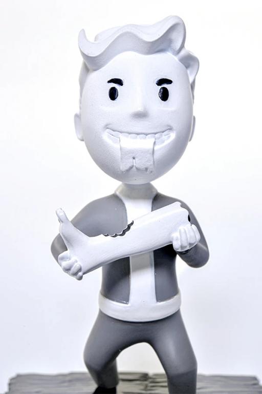 Some Wasteland wanderers have an appetite for mortal flesh. Most companions find this distasteful. But maybe they'd change their tune when you tell them they can have your stimpaks and food. You don't need them anyway. The Wasteland is your buffet. Third in the Gruesome Deaths series, this mini statue depicts Vault Boy feeding on a disembodied leg, presumably after having cleaned all the meat off that skull on the ground. There's a piece of flesh hanging between his teeth. After the leg, he might have some uh... finger food.