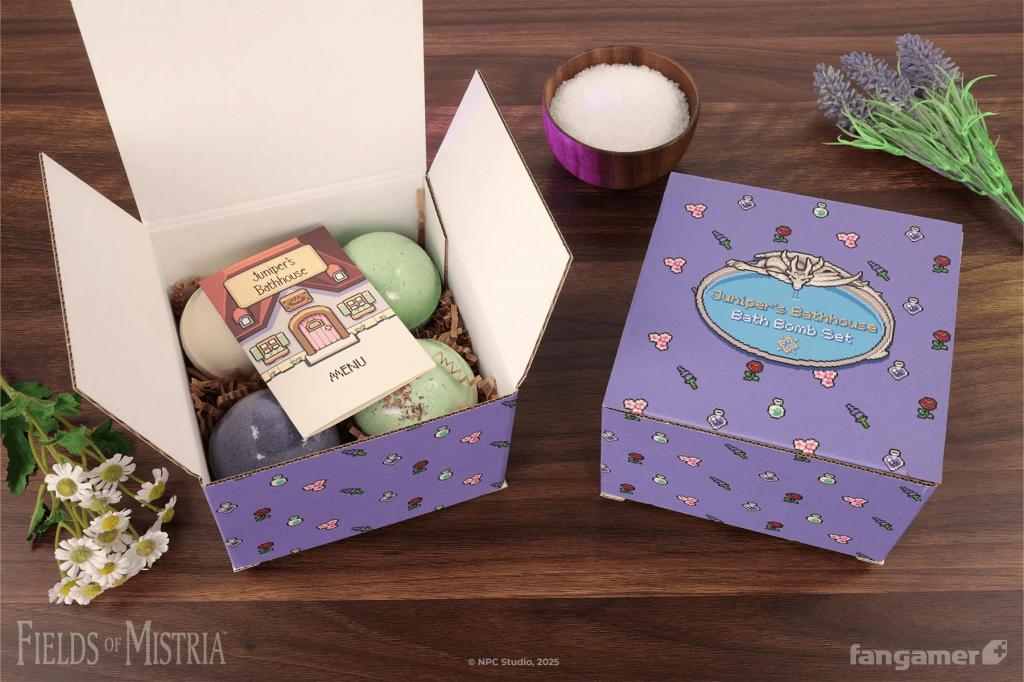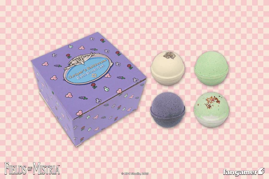 This official Fields of Mistria gift set, designed by Laura Verdin, comes with four special bath bombs: