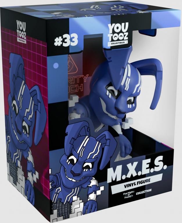 Emerging from a large white digital haze at 4.2 inches tall and reaching out a large hand almost welcomingly, an evil smile stretches wide across M.X.E.S rabbit face as long pointed ears hang down over their face and glowing white eyes shine from dark sockets as digital markings run down their dark blue body. The exterior of their packaging shows M.X.E.S reaching towards you with a large extended hand while the interior is printed with the neon ‘Security breach’ logo and covered in checkered blue and black pattern which works its way onto the protective sleeve as their figure can be seen through the large clear display window at its front. This collectible ships in a matte, embossed, protective outer sleeve and a custom-sized plastic protector for maximum protection during shipping.