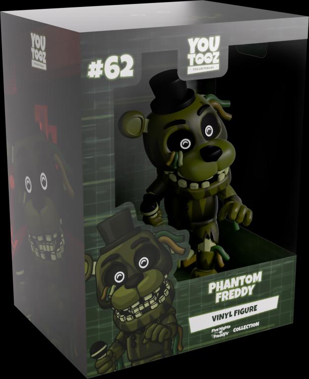 Are we seeing things? Is this real?! It’s got to be! There’s no way we’d imagine Phantom Freddy’s Youtooz debut! At 4.6 inches tall and posed shambling forward on one foot as thick wires replace the missing one to drag on the ground, he stretches a hand out longingly as bright white pupils stare out from dark cavernous sockets. Wearing a black top hat and missing one of his ears, a series of wires spring out from his dilapidated dirty green body as a horrifying smile splits through the middle of his head. The exterior sees a close-up of Freddy as he lunges towards you from a red-light hallway. The interior is covered in a dirty green static which continues onto the protective sleeve where his figure can be seen through the large clear window at the packaging’s front. This collectible was designed in collaboration with @therealracckun and ships in a matte, embossed, protective outer sleeve and a custom-sized plastic protector for maximum protection during shipping.