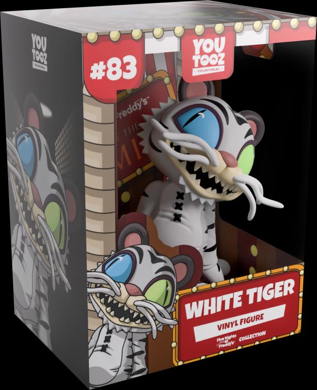 Did you see that? Wait, where’d it go?! It’s back again!! Quick, stay out of the darkness or it’ll get us! Tilting to the side as they stand at 5.1 inches tall with a pair of huge mismatching green and blue eyes staring in different directions, a disturbing smile full of sharp teeth stretches across their pale muzzle underneath long twisting whiskers. With dark round ears poking out from the top of their head and black stripes marking a light grey body, baggy arms hang loosely to either side with purple paw pads resting against their feet as a thick tail stretches out from their back. The exterior of their packaging sees them in a dark room illuminated by a single dull spotlight. While the interior puts them right in the center of a maroon and yellow circus tent with long curtains and strings of lights, this then continues onto the protective sleeve where their figure can be seen through the large clear window at the packaging’s front. This collectible ships in a matte, embossed, protective outer sleeve and a custom-sized plastic protector for maximum protection during shipping.
