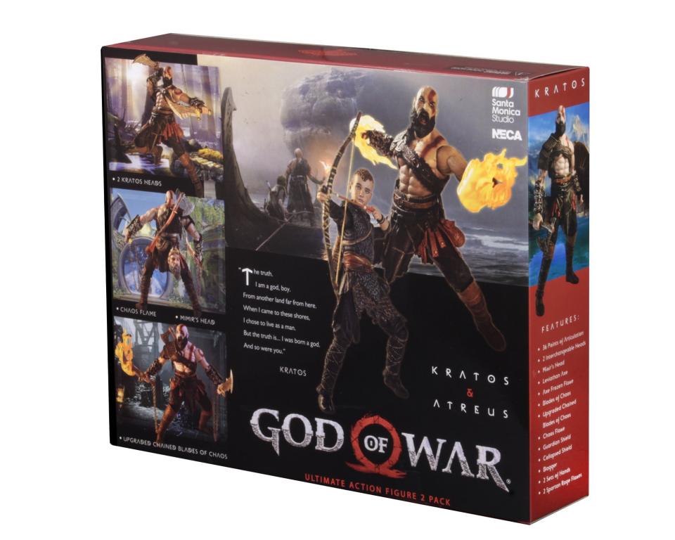 This Ultimate 7" scale action figure 2-pack includes Kratos and his son Atreus. Kratos features a new aggressive head sculpt, new Mimir head on right hip, new gauntlets, new hands, new collapsed shield, new blades, and new fire and frost effects for weapons and hands, as well as 36 points of articulation. The all-new Atreus has over 25 points of articulation and comes with bow and arrows.