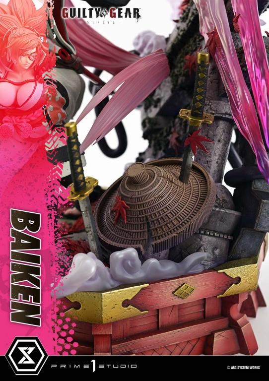 The unfaltering awakened samurai—her indomitable spirit captured in 1/4 scale. A swordswoman, having come to terms with her desire for vengeance, continues on a new journey. From the latest entry in the series, "GUILTY GEAR -STRIVE-", Baiken joins the Ultimate Premium Masterline. With a low, grounded stance and a piercing gaze through her blade Namakura, this piece draws inspiration from the key visual, sealing her fierce spirit within a powerful 1/4 scale form. Aiming to translate the 3DCG “cel-shaded” style that looks indistinguishable from 2D animation into physical sculpture, each surface is rendered with unique color separation, perfectly balanced with realistic shadows and texture. The impression seen on the monitor is brought effortlessly into the real world. An appearance that hints at a fierce past, with a scar showing from beneath the goggles—each detail is carefully sculpted and painted to reveal the traces of her relentless life. Her wild crimson hair uses clear material, its dynamic motion captured through calculated gradients that respond beautifully to light. The layered kimono and haori are crafted with distinct fabric textures, while the skull and plum-blossom patterns evoke a sense of elegance and restraint. The specially designed base incorporates Japanese motifs as an homage to her stage and victory animations. The contrast between gently falling maple leaves and the sharp flash that cuts through darkness deepens immersion into her world.
