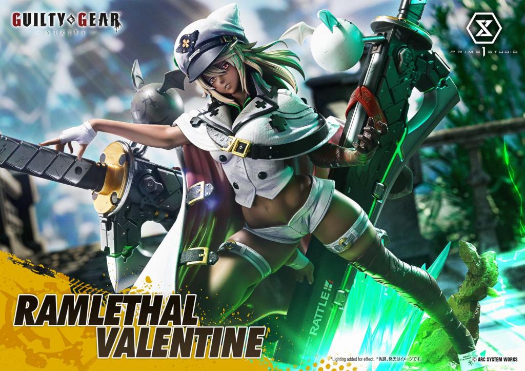 A Valentine harboring hidden emotions, realized in her latest form. Evolving with every season, "GUILTY GEAR -STRIVE-" continues to define the next generation of fighting games. From this acclaimed title, Ramlethal Valentine now joins the Ultimate Premium Masterline. A girl of the Valentines, she serves as commander of Illyria’s Special Brigade, carrying out secret missions under the crown. Her renewed costume has been faithfully recreated in 1/4 scale. With her limbs braced against the crossed Great Swords, the composition is expansive and dynamic, while her nuanced gaze conveys the feelings that sprouted from the previous installment. A flowing white cloak, and imposing pair of Great Swords—every detail of the sculpt and paintwork embodies the challenge of translating the game’s 3DCG “cel-shaded” look into three-dimensional form. Distinctive flat-color segmentation is carefully balanced with realistic shading and textures to capture the impression of the game itself. Her familiars, Velva and Venus, retain their humorous forms while weathering effects and surface details lend them a sense of realism. Bringing out these sculpted and painted details even further is an LED unit built into the specially designed base. Emitting a vivid green effect reminiscent of her Overdrive move “Calvados,” it heightens the immediacy of battle.