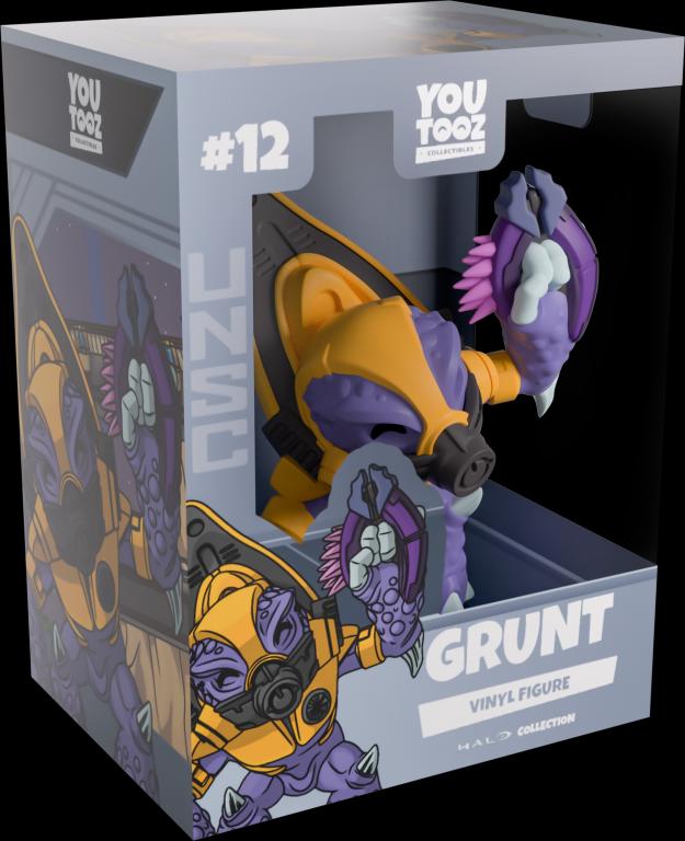 A single Grunt? All by themselves?? Now this will be easy pickings! Standing at 4.2 inches tall with a purple right fist slammed into the ground as they hold a Needler in their raised left hand to taunt a cowering enemy. Bright yellow armor covers their chest and wraps over their head to lead to a raised methane tank on their back, while a grey respirator covers their mouth and spikes extend from the elbows and knees of their scaly purple body. The exterior of their packaging shows a bright blue grenade being thrown from a bridge, while the light grey interior is covered in angled patterns that extend onto the protective sleeve with the UNSC logo as their figure can be seen through the large clear window at the packaging’s front. This collectible ships in a matte, embossed, protective outer sleeve and a custom-sized plastic protector for maximum protection during shipping.