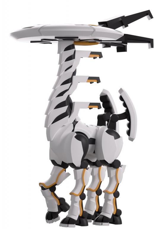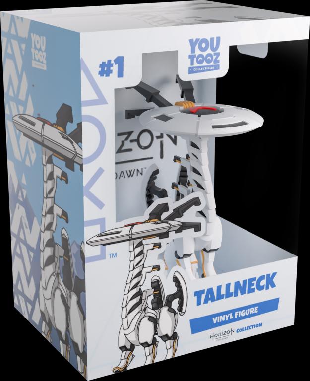 This Tallneck’s route goes straight through Youtooz, so we’re just going to get out of the way and let them do their thing! Standing at a lofty 5.2 inches tall with a circular disk head that has a red data node on the center and segmented plates around the outside, four long antennae stretch out from the back as black and yellow-tipped spines run along their long, segmented neck. With thick white armor covering their body and yellow highlights on their sturdy legs, a pair of tail-like structures raise up from their hips as they trudge forward with a raised leg. The exterior of their packaging sees them lumbering through tall trees, while the interior is covered in a pale blue triangular pattern. The protective sleeve then looks out onto rolling green plains as clouds dance through a blue sky and their figure can be seen through the large clear window at the packaging’s front. This collectible ships in a matte, embossed, protective outer sleeve and a custom-sized plastic protector for maximum protection during shipping.