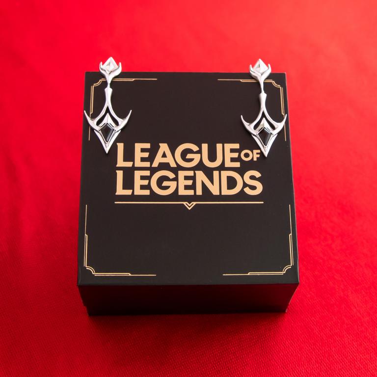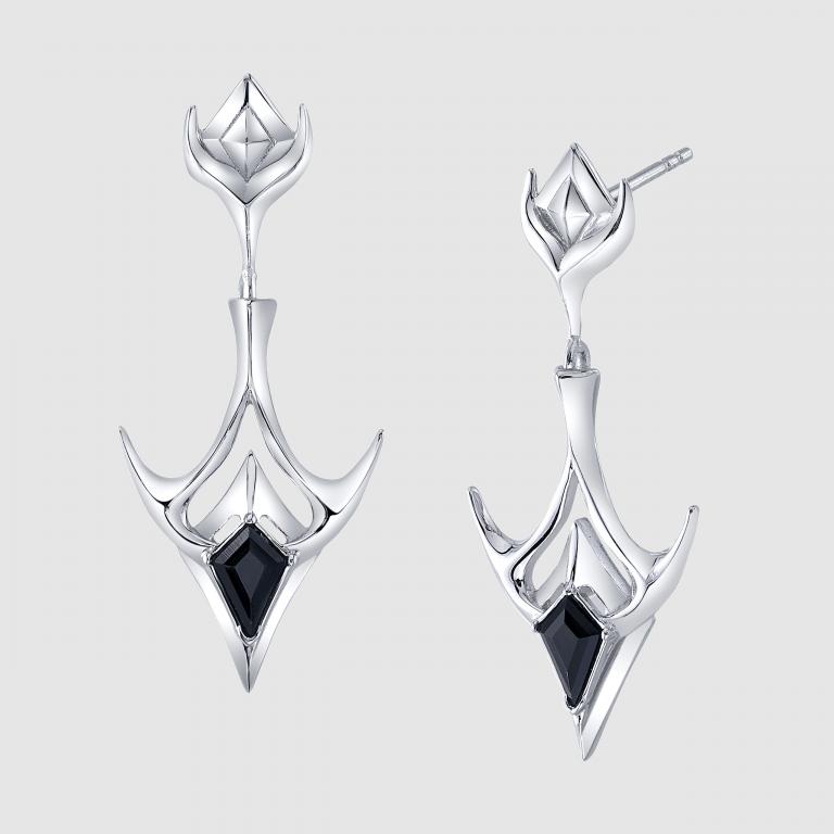 Handcrafted in nickel-free sterling silver, the Coven Morgana Earrings are inspired by the sharp-edged power brandished by the witch-queen. Featuring a custom cut black crystal, a sculpted stud is accented by an elegant articulated dangle reminiscent of the weapons and headdresses seen in game.