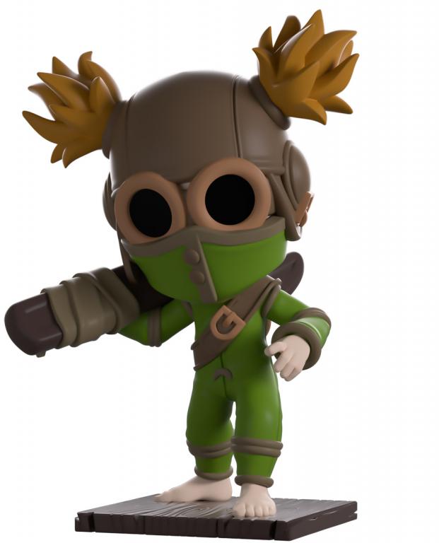 The next stop on Alone's escape from the Spiral is Youtooz! Standing bravely at 5 inches tall as she takes a cautious step forward with bare feet to minimize the noise, she wears an all-green jumpsuit with a giant wrench resting over her right shoulder. With an aviator-style helmet covering her head as a pair of orange pigtails poke through either side, the collar of her jumpsuit reaches up to cover her mouth as large goggles hide her eyes. The exterior of her packaging has been illustrated to show the silhouette of Alone inside a dingy moonlit storeroom. The interior is then covered in a pattern of obscure eyes which work their way onto the protective sleeve that is flooded with blue light from a pale city as her figure can be seen through the large clear window at its front. This collectible ships in a matte, embossed, protective outer sleeve and a custom-sized plastic protector for maximum protection during shipping.