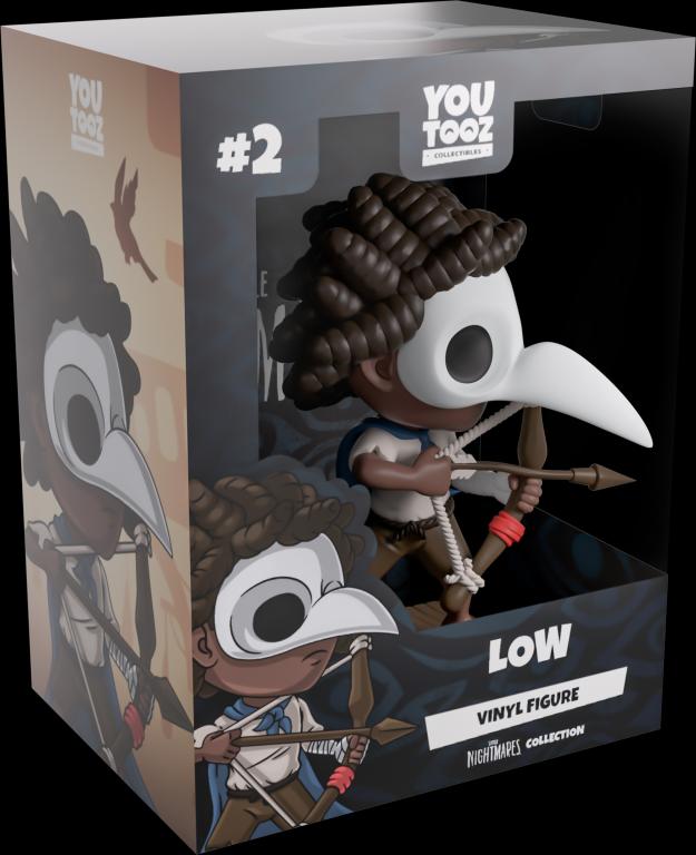 The next stop on Low's escape from the Spiral is Youtooz! Standing bravely at 4.5 inches tall with an arrow drawn in his makeshift brown bow., Low's dressed in brown shorts, a white t-shirt and a blue cape that flows in the wind behind him. Accessorized with a blue and red anklet along with a white raven mask that covers his face, thick braids of black hair flow out from the top of his head. The exterior of his packaging has been illustrated to show Low walking across a wooden beam in front of towering buildings. The interior is then covered in a pattern of obscure eyes which work their way onto the protective sleeve that's flooded with blue light from a pale city as his figure can be seen through the large clear window at its front.. This collectible ships in a matte, embossed, protective outer sleeve and a custom-sized plastic protector for maximum protection during shipping.