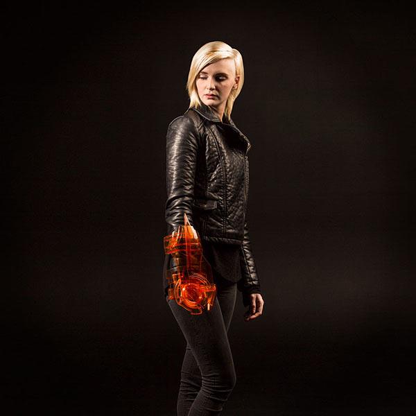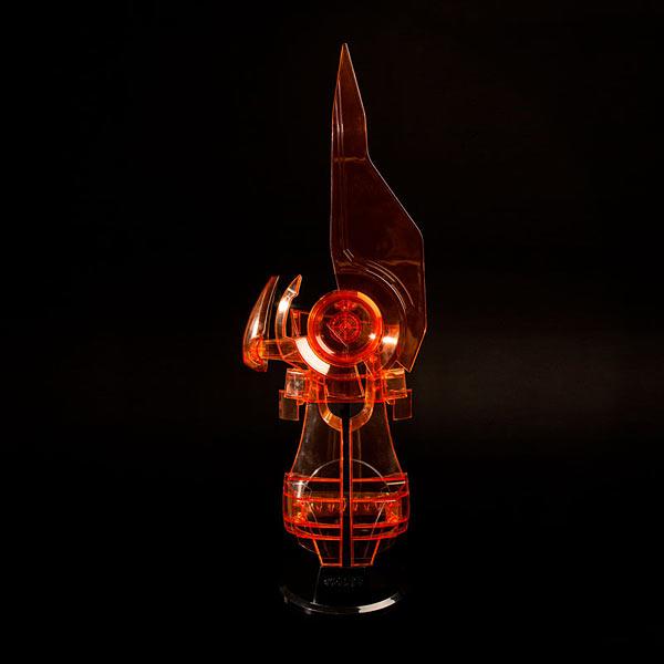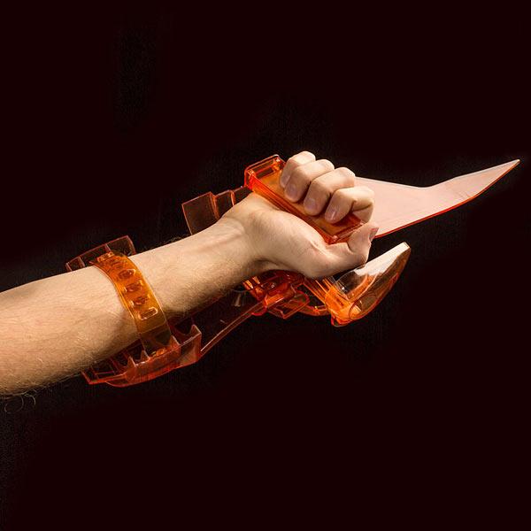 This Omni-Blade Cosplay Weapon is made from transparent orange resin (bypassing the hologram problem altogether). Intended for right-handed cosplayers, a switch on the disc lets you swing the blade out or sheathe it along your arm. The adjustable forearm strap means this fits a wide variety of Sheps and non-Sheps, armored or not.