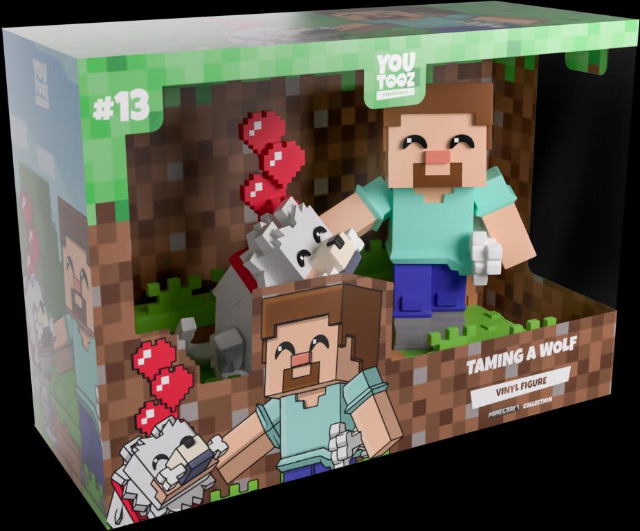 Move over dogs, cause now Wolves are man’s best friend! Well... in Minecraft of course... At 4.9 inches tall, this scene sees Steve lovingly reaching out a blocky hand to the happiest tame Wolf who looks up delightedly with a bone held in their mouth and a bunch of bright red hearts rising from their head. Not knowing just how many it would take to win over his fluffy new friend, Steve has a bundle of bones tucked under his arm as he wears an iconic aqua shirt and blue pants with brown hair covering his square head. The exterior of their packaging is a first-person look at a delighted wolf. The interior surrounds them in brown dirt blocks, which continue onto the protective sleeve as their figures can be seen through the large clear window at the packaging’s front. This collectible ships in a matte, embossed, protective outer sleeve and a custom-sized plastic protector for maximum protection during shipping.