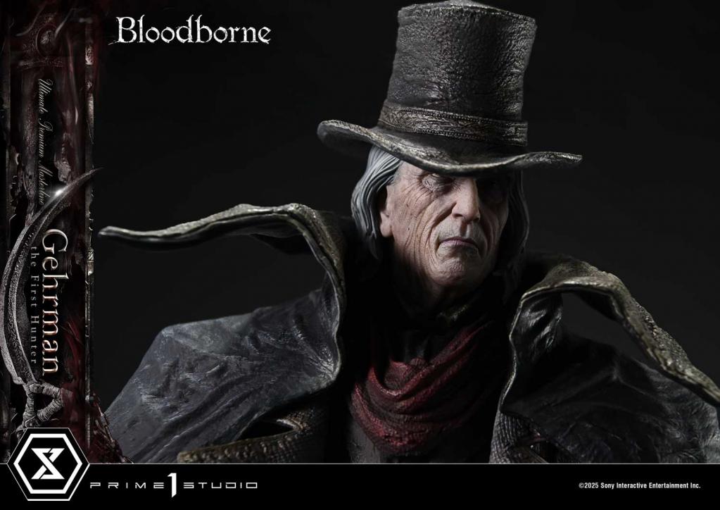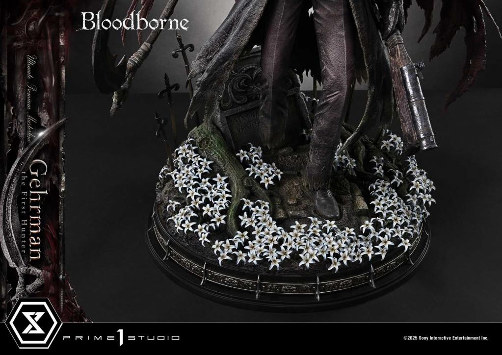 The First Hunter, sculpted in the secluded garden of the dream. FromSoftware and SIE JAPAN Studio's "Bloodborne," the iconic action RPG. From this masterpiece, Gehrman, the First Hunter, joins the Ultimate Premium Masterline lineup. A soft-spoken old man in a wheelchair, veiled in shadow. This statue captures the overwhelming tension of the moment he rises before you—ready to respond to your final choice. With his weight placed firmly on his left foot and his long coat rippling with movement, the figure conveys a sense of "impending finality." The forward-leaning pose cuts through the air with sharp presence, defying age and prosthesis alike. Beneath his hunter’s cap are deeply carved wrinkles and dark gray hair, painstakingly sculpted. His downcast gaze, rendered with high precision, reflects not only resolve, but also "regret and sorrow." His well-worn attire is finished with subtle fading and frayed textures, evoking the passage of countless years. Even his weathered leather shoes speak to time's wear. In his right hand he holds the Burial Blade, and in his left, the shotgun—both treated with material-specific weathering effects that add weight and realism to their presence. The specially crafted base is inspired by that "secluded garden" beyond the gate. A dense bloom of white flowers surrounds cracked gravestones and rusted iron fencing, vividly conjuring the scene of that fateful decision.