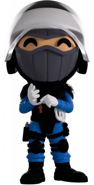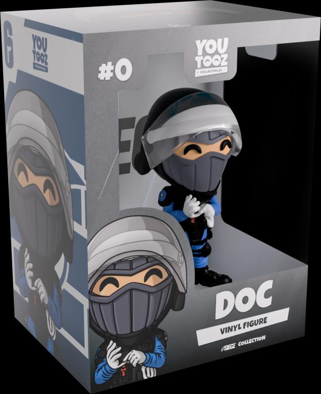 Need a revive? Well Doc’s got you covered with his Youtooz debut! Standing at 4.4 inches tall with his eyes peering through the slit of the grey balaclava pulled over his face and wearing a protective black helmet with the visor flipped up, he holds his hands forward and pulls on one of his bright white gloves. Dressed in a blue jumpsuit with a black flak jacket over his torso and protective pads on the elbows and knees, his trusty stim pistol is strapped to his thigh at the ready! The exterior of the packaging sees his light silhouette over a cool blue background, while the interior has diagonal grey streaks running across it with the Rainbow 6 Siege logo printed on the back.Protective sleeve is then split between black and grey as his figure can be seen through the large clear window at the packaging’s front. This collectible was designed in collaboration with community member @therealracckun and ships in a matte, embossed, protective outer sleeve and a custom-sized plastic protector for maximum protection during shipping.
