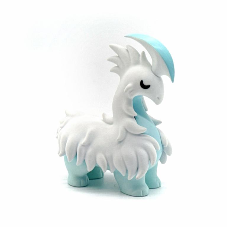 Youtooz has been graced by a majestic Thrumbo who’s wandered in for their debut! Standing at 4.9 inches tall with a long neck curling forward and a long, sharp horn stretching out from the top of their forehead, mellow black eyes look forward as thick white fur covers the top of their pale blue body that’s held up by four chunky legs. The exterior of their packaging has her centered in a brown field that’s scattered with rocks as a stone path runs through the center. While the interior sees a ringed planet amidst the star-speckled darkness of space, this then continues onto the protective sleeve as her figure can be seen through the large clear window at the packaging’s front. This collectible ships in a matte, embossed, protective outer sleeve and a custom-sized plastic protector for maximum protection during shipping.