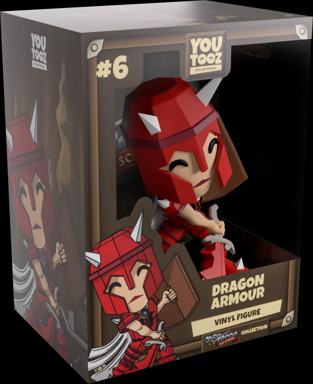 Time to get geared up! Because only the strongest armour will help you survive! Standing at 4.8 inches tall and slashing a dragon scimitar in a low sweep to the front, he’s fully kitted out with full dragon armour, holding a matching square shield in the other hand and wearing a med helmet with pointed white horns. With a purple jewelled Amulet of Glory hanging from their neck as a long white Cape of Legends flows from their shoulders, a black dragon marks the front of their chainbody as thick plates cover their legs and sharp points stick out from the top of their boots. The exterior of the packaging sees a discarded Anti-dragon Shield thrust into the ground behind a stream of bright lava. While the interior is covered with patchwork stone as vines wrap around cobbled pillars, this then continues onto the protective sleeve, where the figure can be seen through the large clear window at the packaging’s front.