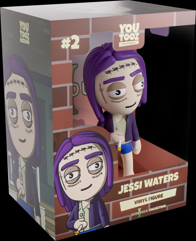 Have you got the stuff? You know the… good stuff??... Oh yeah, that’s it! The Jessi Waters Youtooz! Standing at 4.5 inches tall and tilting her head to the side with deep purple hair hanging down to her shoulders, tattoos run down the side and across the forehead of her pale face while curving under each dark eye. Dressed in a dark blue jacket over her pale green shirt and short shorts, she holds a lit joint in her right hand and wears dark slides. The exterior of her packing sees her standing behind the white railing of the motel, while the interior looks onto a dusty pink desert with a single barren road running over a shaded hill. The protective sleeve is then covered in plants under hazy purple light as his figure can be seen through the large, clear window at the packaging’s front. This collectible ships in a matte, embossed, protective outer sleeve and a custom-sized plastic protector for maximum protection during shipping.