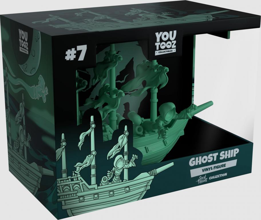 The ghost ship sails in at 3.6 inches, coated with glow in the dark PVC to make the figure stand out during the night. The ship strikes an attack as they catapult one of their ghosts through their cannons. The exterior of this double-walled window box shows a battle at sea through an all blue colorway. The interior is an all black background with a light teal skull silhouette fading through. The protective sleeve shows a Ghost ship at sea with a few handful of ghosts flying alongside it. This collectible ships in a matte, embossed, protective outer sleeve and a custom sized plastic protector for maximum protection during shipping.