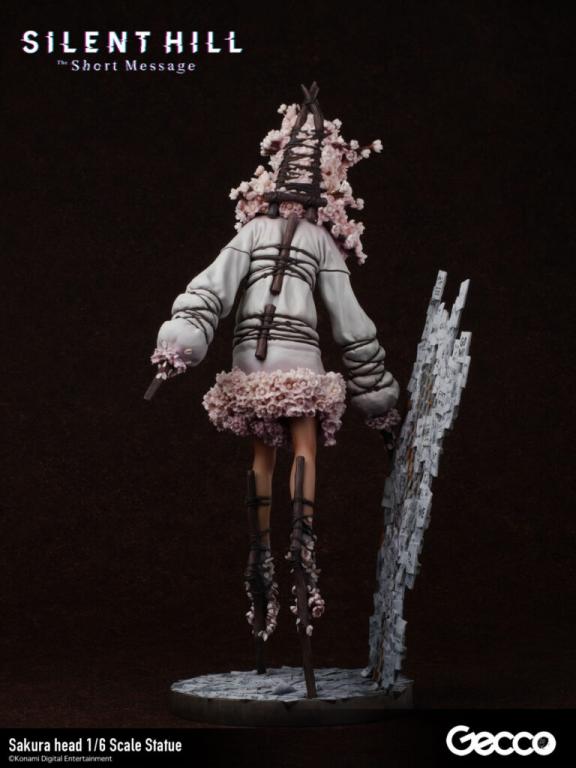 The psychological horror game “SILENT HILL: The Short Message” focuses on the common fears of today, and the Sakura head featured heavily in the game is recreated here as a 1/6 scale statue. Thoroughly supervised by Masahiro Ito, the game's concept artist, this is the first produced statue piece for the next generation of SILENT HILL fans. The sculpture captures the "fragile beauty" symbolized by cherry blossoms and the "haunting horror" that psychologically drives players in the labyrinth-like underworld. Great care has been taken in sculpting the body lines and legs to express the beauty that exists within the eerie creature. The base is made in the image of the abandoned apartment building, detailed with sticky notes with curse words scattered on the fence and floor.