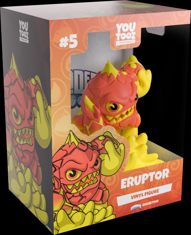 Eruptor has, well, erupted into Youtooz for their vinyl debut! Throwing their body forward at 3.3 inches tall as they slam a fist into the ground at their front, thick yellow lava spews from underneath them in devastating thick tendrils ready to burn away anything in their path. With a fiery red body that’s covered in thick plates and intense eyes staring out from above a tooth-filled smile, a spike of lava points out from the top of their head as they pull their right hand back to unleash another heated blow. The exterior of his packaging sees him surrounded by hot magma and dark brown rocks. While the light interior is covered in white circles that show off the different elements, this design then continues onto the protective sleeve, where his figure can be seen through the large, clear window at the packaging’s front. This collectible ships in a matte, embossed, protective outer sleeve and a custom-sized plastic protector for maximum protection during shipping.