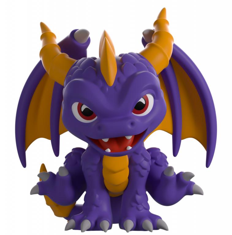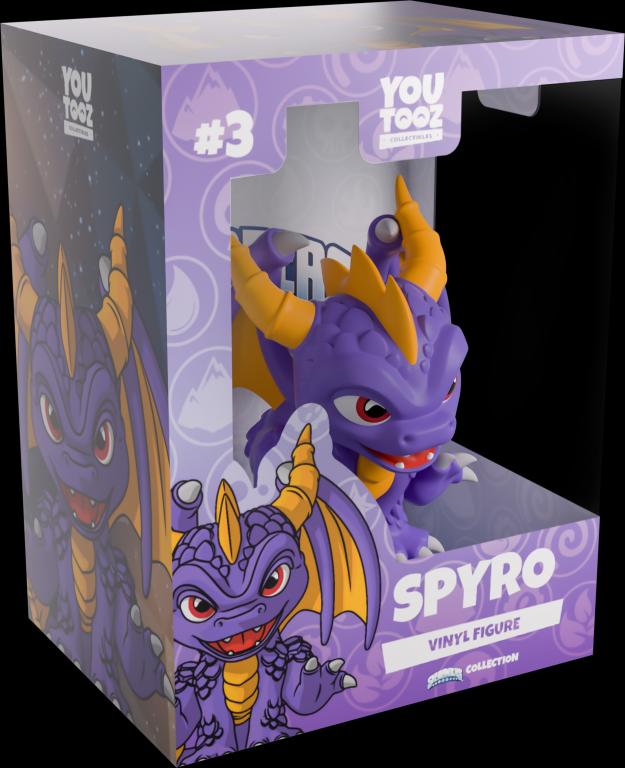 Spyro’s been summoned back into Youtooz for a brand new vinyl figure! Leaping in at 3.2 inches tall with his front legs planted firmly on the ground as the back thrusts forward on either side, he’s balanced on his curling tail that has a bright yellow tip as thick scales cover his purple body. With deep red eyes staring out from under a thick brow as his mouth opens into a playful smile, a pair of segmented horns stretch out from the top of his head on either side of a jagged fin as spikes run down his back between a pair of spread wings. The exterior sees him atop a grey asteroid that’s flying through space. While the light interior is covered in white circles that show off the different elements, this design then continues onto the protective sleeve, where his figure can be seen through the large, clear window at the packaging’s front. This collectible ships in a matte, embossed, protective outer sleeve and a custom-sized plastic protector for maximum protection during shipping.