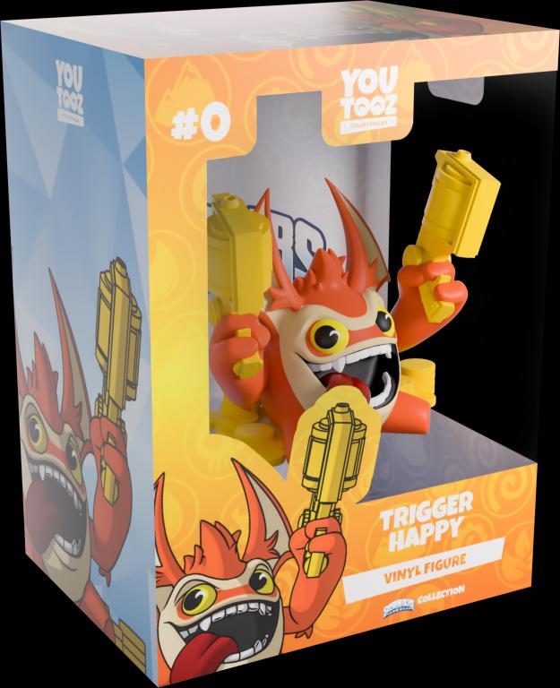 Hide the gold! Trigger Happy is here! Sitting against a pile of gold coins at 3.4 inches tall, as he throws up a pair of huge pistols to point towards the sky, a long red tongue hangs from his toothy open mouth as he glances to the side with bright yellow eyes. With a thick brow topping his pale face as a tuft of pair flicks up between two long jagged ears, short thick legs poke out from the base of his round body. The exterior of his packaging sees him nestled in a huge pile of coins as a jagged blue triangle pattern fills the background. The light interior is then covered in white circles that show off the different elements, this design then continues onto the protective sleeve, where his figure can be seen through the large, clear window at the packaging’s front. This collectible ships in a matte, embossed, protective outer sleeve and a custom-sized plastic protector for maximum protection during shipping.