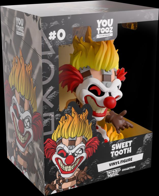 It’s that time of year again… for Twisted Metal! And Sweet Tooth is making sure we know he’s gonna win with his Youtooz debut! Standing at 5 inches tall with a horrific smile stretching across his white mask as a red pupil and cracked eyeball peer out from above its raised cheeks, tufts of red hair poke out from either side of his head as thick flames billow out from the top to match the fire curling around his feet. Brandishing a long knife in his gloved right hand while the other is thrust out beckoningly, he wears a brown harness strapped around his chest along with polka dot red and white pants and thick boots. The exterior of their package is littered with newspapers talking about the gruesome killer, while the interior is a sandy brown with a deep tear across the top. The protective sleeve is then covered in black asphalt as his figure can be seen through the large, clear window at the packaging’s front. This collectible ships in a matte, embossed, protective outer sleeve and a custom-sized plastic protector for maximum protection during shipping.