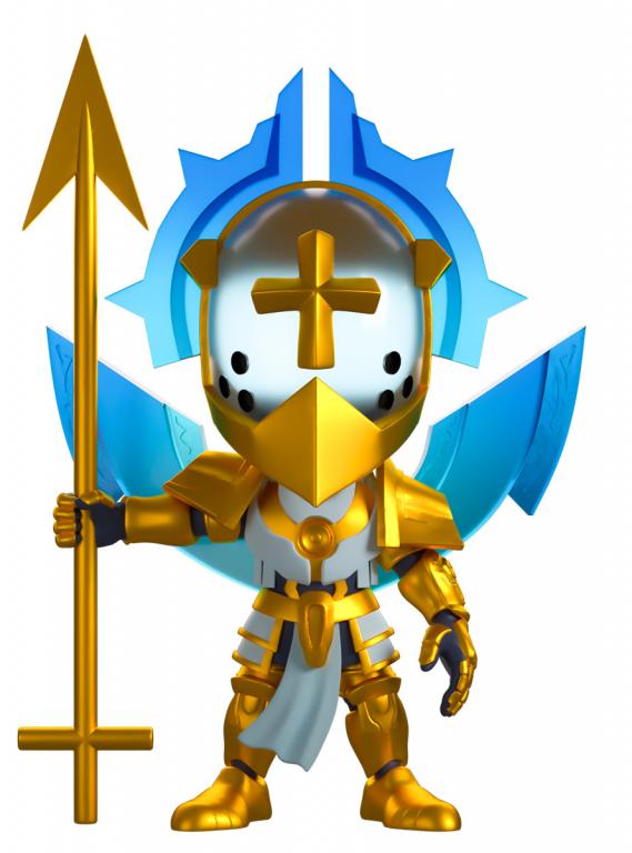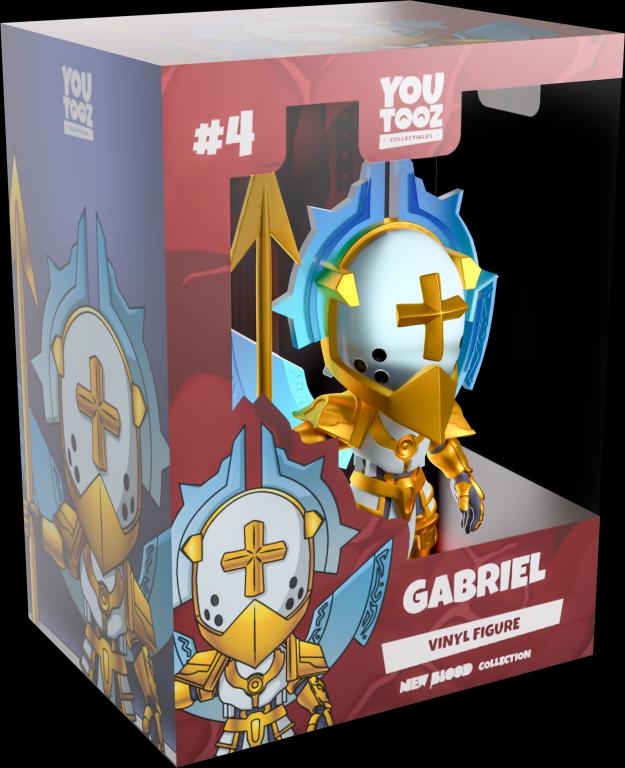 The will of the council has sent Gabriel to Youtooz to bring around our righteous destruction! Wait a minute… Standing at 5.4 inches tall and holding a long pointed spear to his right side, a pale helmet covers his head with three holes on either side and a gold cross at the center, which matches the pointed chin and band running around its back. With a pointed blue halo reaching up from his head and curved wings extending from each shoulder, vibrant gold armour covers his body with thick pauldrons and sturdy boots as a waist cloth blows to the side. The exterior of his packaging sees him kneeling in a bright circle of light, while the interior looks into a dimly lit red throne room. The protective sleeve is then covered with a fleshy red membrane, as his figure can be seen through the large, clear window at the packaging’s front. This collectible ships in a matte, embossed, protective outer sleeve and a custom-sized plastic protector for maximum protection during shipping.