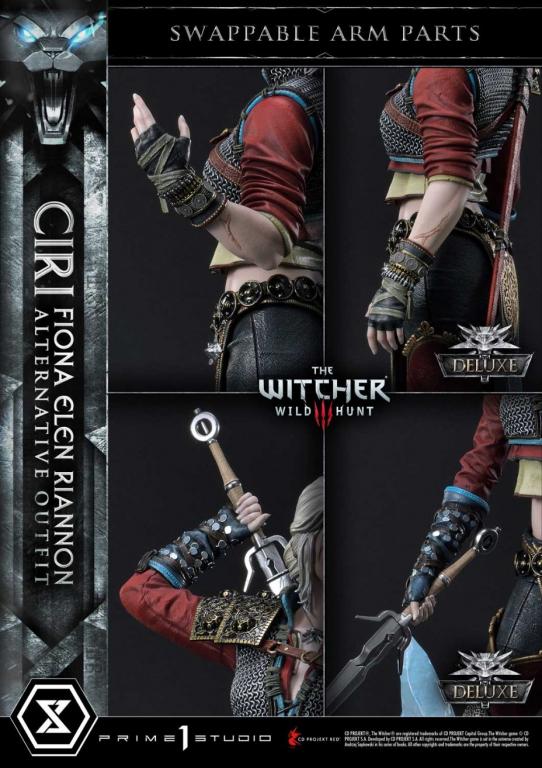 The Deluxe Bonus Version comes with two (2) sets of Swappable Arms to extend your storytelling. Her right arm can either be drawing her trusty sword, Zireael, or already holding it out. And her left arm is ready to block up or down! Moreover, if you order from Prime 1 Studio’s online store and authorized dealer, Ciri will come with a fifth swappable arm: it features her left hand clutching the iconic Cat School Medallion she lifted from the corpse of Leo Bonhart!