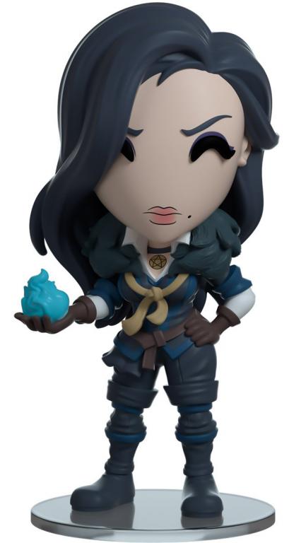The beautiful and cunning Yennefer makes her grand entrance to Youtooz! Sculpted at 4.6 inches, Yennefer is standing with a pose that exudes calmness yet confidence. Her hair is styled with a side part and her blue-black hair shines. With her left hand resting on her hip, her right hand is out to her side with her palm upward, holding a blue flame. She is accessorized with her star necklace around her neck and her outfit is a uniform made with a blue, brown and white color palette. She has a fierce yet determined look on her face with her distinguished mole towards the bottom left of her mouth. The exterior of her double-walled packaging shows the middle of the forest with fires scattered around and bloodied weapons on the ground. The interior is a light blue to white faded background with red flames towards the bottom and The Witcher symbol printed in the center. This collectible ships in a matte, embossed, protective outer sleeve and a custom sized plastic protector for maximum protection during shipping.