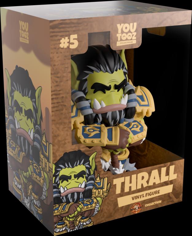 Thrall, the founder and ruler of the of Durotar has decreed that he needs a Youtooz figure and we have obliged! Standing peacefully at 4.8 inches tall with both hands resting on the hilt of his upturned axe, he's dressed ready for war with bulky, gold detailed, blue armor on his shins, forearms, shoulders and waist. While under his armour he wears brown pants, a leather chest harness and brown gloves as white fur details pop through around his waist, from his gloves and the top of his boots. With a solemn face that's framed by grey and black hair that is pushed back for his ears to pop through, sharp teeth poke up from his lower jaw through closed lips as his black and grey bead covers his chin. The exterior of their packaging has been illustrated to show a horde flag billowing in the wind with jagged cliffs shown in the distance under thick clouds. While the interior shows the iconic map of the realm of Azeroth which continues onto the protective sleeve as their figure can be seen through the large clear window at the packaging's front. This collectible ships in a matte, embossed, protective outer sleeve and a custom-sized plastic protector for maximum protection during shipping.